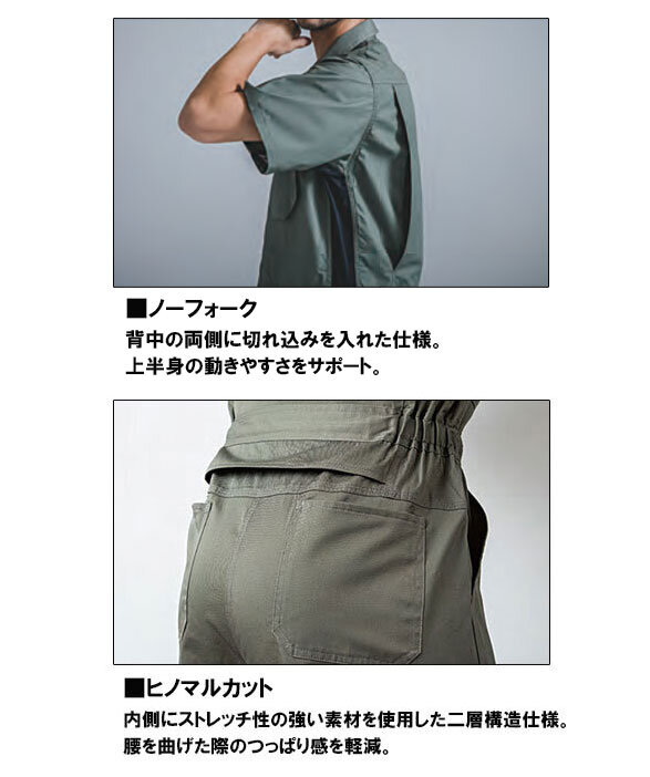 ■ヒノマルカット(腰部分の内側にストレッチ性の良い素材を使用した二層構造仕様。腰を曲げた際のツッパリ感を軽減。)