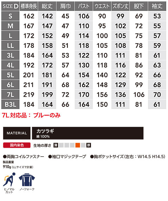 ■袖口:マジックテープ ■左袖ペン差し ■製品重量:910g(LLサイズ)