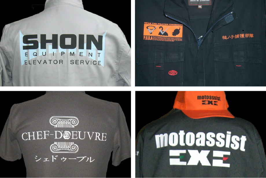 ツナギに熱圧着プリントしますので下地の影響をほとんど受けず、濃色のつなぎ服にも鮮やかな発色です。また、つなぎ服の色々な所にプリント出来ます。